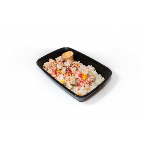 Grilled Chicken breast with basmati rice, roasted corn, hatch chiles, cojita cheese, cilantro, and elote sauce onside, lime wedge. *Gluten Free*