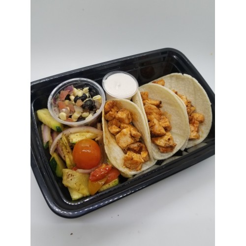 Southwest seasoned chicken breast, corn tortillas, black bean pico, roasted corn, sautéed zucchini, chipotle lime sour cream onside and . Gluten Free.
