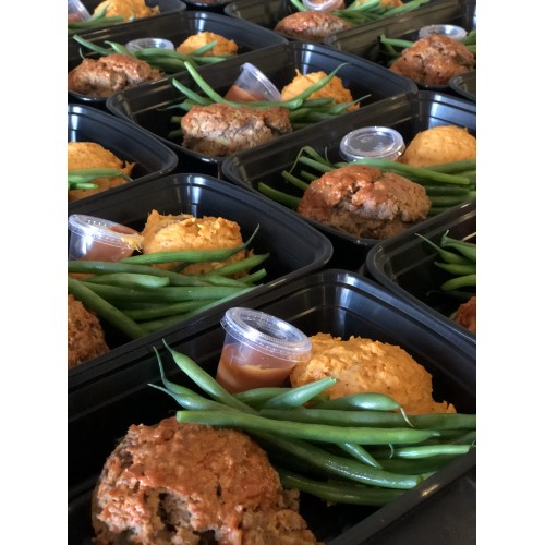Seasoned ground turkey meatloaf with yukon potatoes, sweet potatoes, and green beans with a side of our kicked up ketchup. *Gluten Free*