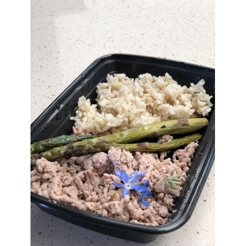 Lean ground turkey, grilled asparagus spears and garden rice. Enjoy or add your own seasoning. Gluten free.