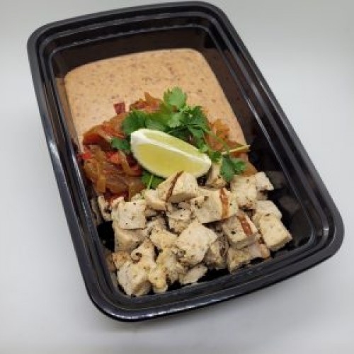 Seasoned grilled chicken breast , with sautéed peppers and onions, sriracha and kidney bean puree, avocado puree onside topped with cilantro and a lime wedge