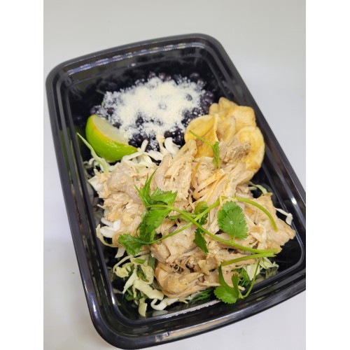 Slow simmered shredded chicken served with black beans topped with cotija cheese, herb cabbage salad and banana chips, cilantro, and lime with a side of orange mojo sauce. *Contains Gluten*
