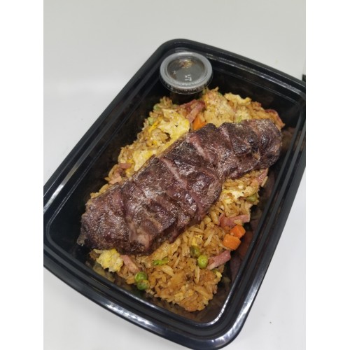Basmati white rice sauteed with peas, carrots, center cut top sirloin steak, scrambled eggs, seasoning and teriyaki sauce. Topped with micro cilantro and sesame seeds