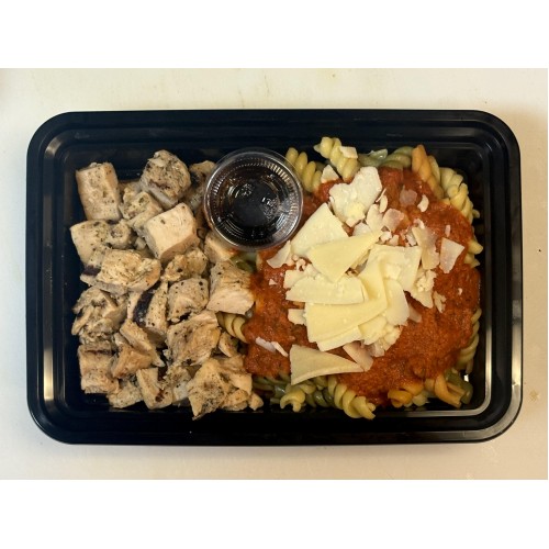Grilled chicken breast with tri color rotini pasta, topped with romesco sauce and parmesan cheese, Balsamic glaze.