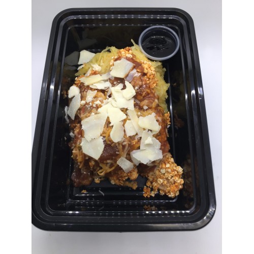Baked chicken tenders coated in steel cut oats, on roasted spaghetti squash topped with marinara and cheese blend with a balsamic glaze on the side.