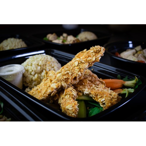 Oatmeal crusted chicken tenders, rolled oat crusted chicken tenders baked just right with ranch flavored brown rice, baby carrots and celery with a ranch dipping sauce *Contains Gluten*