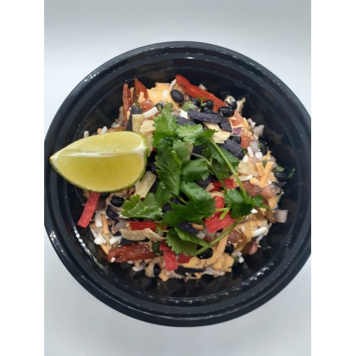 Grilled chicken breast, cilantro lime brown rice, sauteed onions and bell peppers, black bean pico de gallo, dairy free cheese sauce and follow your heart shredded cheese, tortilla strips, cilantro, lime wedge