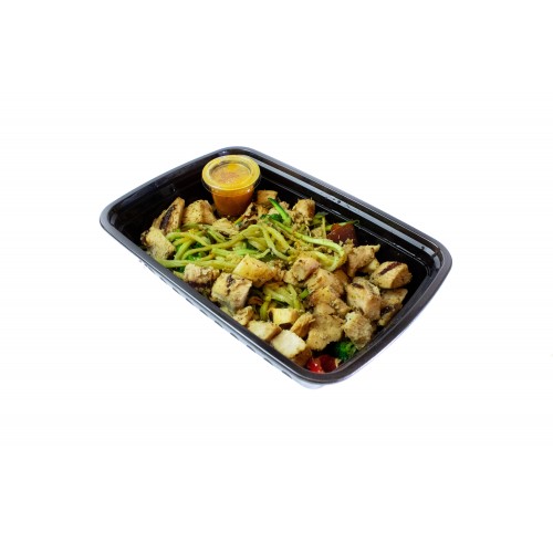 Sautéed seasonal vegetables in our sweet and mildly spicy citrus sauce on top of sautéed zucchini noodles with grilled chicken breast topped with micro greens, sesame seeds and a side of teriyaki sauce