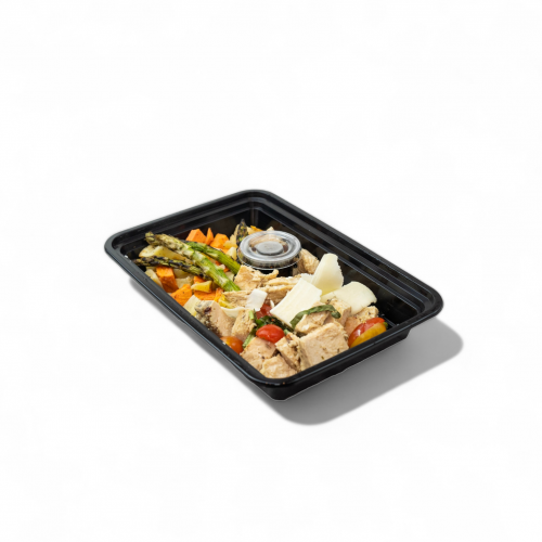 Grilled chicken breast with Italian herbs, tomatoes, onion, basil, parmesan cheese, balsamic glaze, roasted Yukon and sweet potatoes, and grilled asparagus. *Gluten Free*