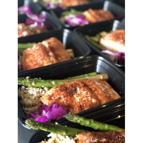 Salmon roasted with our chili lime seasoning, served with brown rice and grilled asparagus spears. *Gluten Free*