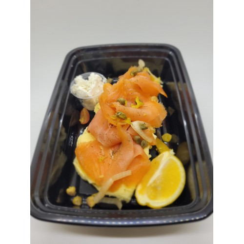 2 whites to 1 whole omelet topped with smoked salmon and a caper relish and goat cheese on the side.
