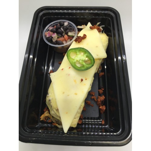 Omelet stuffed with soyrizo, hashbrowns, topped with pepper jack cheese and a sliced jalapeno with black bean pico on the side.