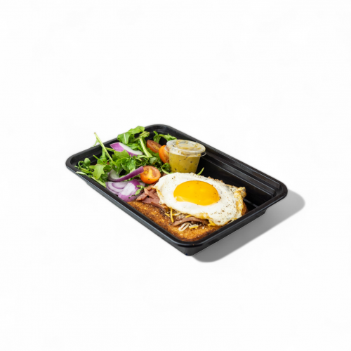 Multi grain bread, chipotle avocado smash, turkey bacon, cheese blend, 2 eggs, cherry tomatoes, balsamic glaze, topped with arugula salad.