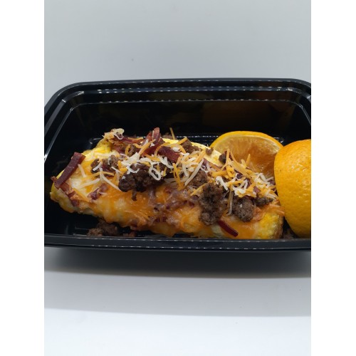 Eggs 2 whole 4 whites, bacon, ground turkey, hash browns, cheddar cheese, arugula. *Gluten Free*