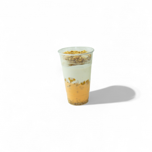 A mix of vanilla, and peach non fat greek yogurt, peach chunks, topped with granola. *Contains Gluten and Nuts in Granola*