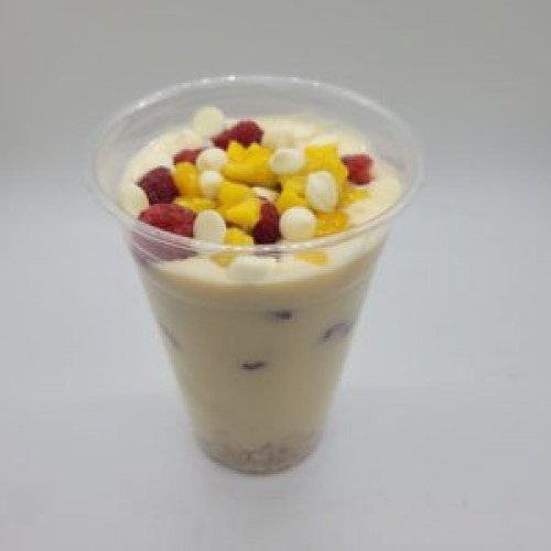 A mix of honey, vanilla, mango and non fat Greek yogurt, mango chunks and fresh raspberries, white chocolate chips and granola. *Contains Gluten and Nuts in Granola*