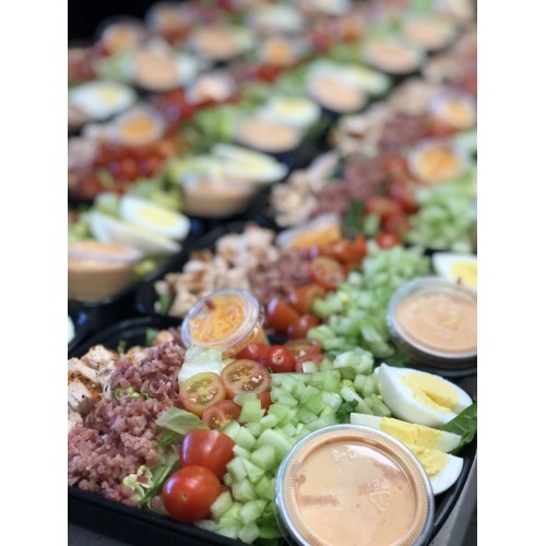 Chicken and bacon over romaine with cherry tomatoes, cucumber, hard boiled egg and cheddar with a side of house-made sriracha ranch.