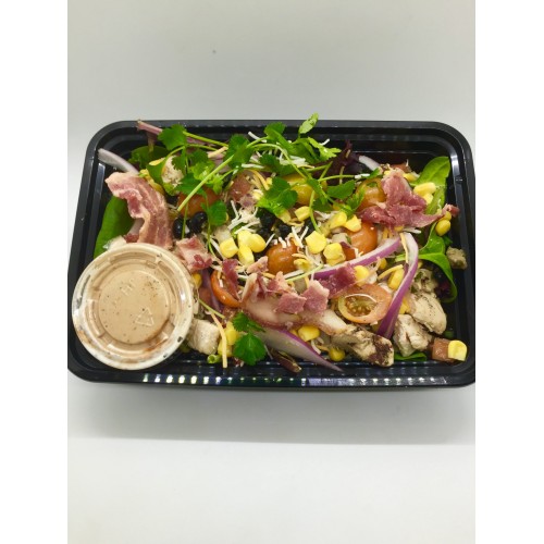 Chicken and bacon over mixed greens with cherry tomatoes, red onions roasted corn, black beans and cheddar cheese blend with a side of house-made BBQ ranch.