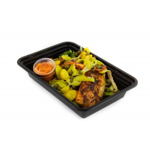 Cajun grilled white fish on a bed of sautéed zucchini noodles, grilled asparagus and topped with caper tomato relish and red pepper sauce. (Gluten Free)