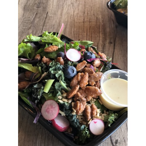 Organic kale and power spring mix topped with sunflower seeds, radish, fresh blueberries, candied almonds and a house made mimosa citrus dressing. Gluten free.