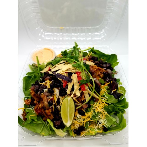 Mixed greens ground turkey tossed in fajita sauce, sautéed onions and peppers, low fat cheese blend, cherry tomatoes, black bean pico de gallo, cilantro, tortilla strips, lime wedge, buffalo ranch *Gluten Free*