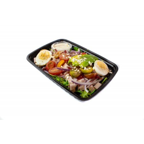 Mixed greens, turkey breast, turkey bacon, hard boiled egg, red onion, cherry tomato, avocado, feta cheese and side of ranch.