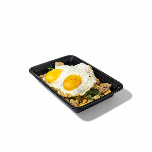 373cal / 33g protein / 22g carbs / 17g fat, Ground turkey, 2 sunny side eggs, roasted yukon & sweet potatoes, arugula, feta cheese.